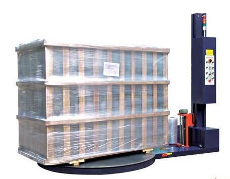 这是一种最普遍最广泛的机械包装形式,由托盘旋转或膜绕托盘旋转,薄膜固定在支架上可上下移动。这种包装能力很大,每小时约15~18盘。适合的膜厚约15~25μm;